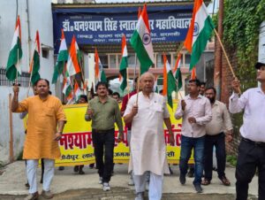 वाराणसी। घर घर तिरंगा अभियान के तहत स्वतंत्रता दिवस की पूर्व संध्या पर लालपुर सोयेपुर स्थित डॉ घनश्याम सिंह पीजी कॉलेज के छात्र-छात्राओं ने तिरंगा यात्रा रैली निकाली। प्रबंधक नागेश्वर सिंह के नेतृत्व में छात्र-छात्राओं ने हाथ में तिरंगा लेकर इंक़लाब जिंदाबाद, विजयी विश्व तिरंगा प्यारा, झंडा ऊँचा रहें हमारा का नारा लगाते हुए आस पास के क्षेत्रों से होते हुए लोगों को घर पर एक तिरंगा झंडा लगाने की अपील कर रहे थे।
