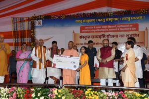 वाराणसी। उत्तर प्रदेश के मुख्यमंत्री योगी आदित्यनाथ ने विद्या की राजधानी काशी से रविवार को उत्तर प्रदेश के समस्त संस्कृत विद्यालयों, महाविद्यालयों एवं संपूर्णानंद संस्कृत विश्वविद्यालय के संस्कृत विद्यार्थियों के लिए छात्रवृत्ति योजना की विधिवत शुरुआत की। संपूर्णानंद संस्कृत विश्वविद्यालय परिसर के दीक्षा प्रांगण में आयोजित भव्य कार्यक्रम में मुख्यमंत्री योगी आदित्यनाथ ने कंप्यूटर के माउस को क्लिक कर प्रदेश के 69195 संस्कृत विद्यार्थियों के बैंक खाते में एक साथ 586 लाख रूपये की धनराशि छात्रवृत्ति के रूप में स्थानांतरित किया। बैंक खातों में छात्रवृत्ति की धनराशि डिजिटली ट्रांसफर होने पर मौके पर मौजूद छात्रों के चेहरे खुशी से खिल उठे। इसमें विश्वविद्यालय के 36 विद्यार्थी शामिल हैं। इस अवसर पर मुख्यमंत्री ने मंच से प्रतीकात्मक रूप से सुहानी, पूजा शुक्ला, रंजना, कृष्णा, आर्यन, अभिनव मिश्रा, स्मिता, अमन, योगेश दुबे, प्रिंस पाण्डेय, हर्ष मिश्रा सहित 12 बच्चों को छात्रवृत्ति उपलब्ध करायी।