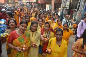 कलश यात्रा में लगभग 150 सौ महिलाएं पीला वस्त्र धारण कर हाथ में कलश गंगाजल लेकर ओम नमः शिवाय, ओम नमः शिवाय, हर हर महादेव के उद्घोष के साथ रास्ते भर चल रही थी। कलश शोभा यात्रा का नेतृत्व विशालाक्षी मंदिर के महंत पंडित राजनाथ तिवारी, श्रीकांत पांडे, अजय शर्मा, शंकर घोष, नितिन तिवारी कर रहे थे।