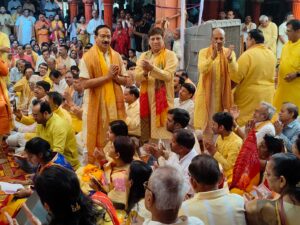 वाराणसी। श्री रामनवमी पर काशी अग्रवाल समाज के सदस्यों ने संकटमोचन मंदिर में सुंदरकांड का संगीतमय पाठ किया। समाज के सभापति संतोष कुमार अग्रवाल एवं रंजना अग्रवाल के नेतृत्व में सैकड़ो सदस्यों एवं महिलाओं ने श्री हनुमान ध्वजा लेकर धर्मसंघ से संकटमोचन मंदिर तक नंगे पाँव ध्वजा लेकर हनुमान जी के चरणों में अर्पित किया। समाज सेवा विभाग ने शिविर लगाकर भक्तो को शीतल जल पिलाया। अध्यक्ष शशिबाला शाह ने ध्वजा यात्रा में शामिल भक्तों पर पुष्पवर्षा कर स्वागत किया। संकटमोचन मंदिर में सभी भक्तों ने श्रीराम की स्तुति कर हनुमान चालीसा और सुंदरकांड का पाठ किया। मंदिर का पूरा वातावरण श्री रामचरित मानस की चौपाइयों एवं जय श्री राम के नारे से गूँजता रहा। अंत मे प्रसाद का वितरण किया गया। इस अवसर पर कौशल शर्मा, महेश चौधरी, अरविन्द जैन, संजीव अग्रवाल, दीपक अग्रवाल ‘लायन’, मंत्री समाज राजकिशोर चंद्र अग्रवाल, समाज सेवा मंत्री बृजकमल दास अग्रवाल, मोहन अग्रवाल, भूपेंद्र अग्रवाल, बजरंग अग्रवाल, अतुल गोयल, रौनक गोयल, अमरचंद अग्रवाल, दीपक अग्रवाल ‘शिवाला’, दिनेश अग्रवाल, अर्चना अग्रवाल, प्रीति अग्रवाल, सुनीता अग्रवाल, शालिनी अग्रवाल, उषा गनेरीवाल आदि थे।