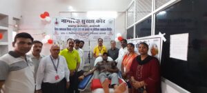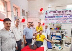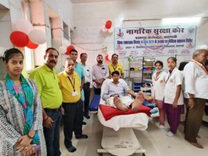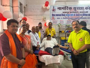 वाराणसी। नागरिक सुरक्षा कलेक्ट्रेट प्रखंड की ओर से शनिवार को विश्व रक्तदाता दिवस पर जिला चिकित्सालय में रक्तदान शिविर आयोजित किया गया। शिविर का शुभारंभ उप नियंत्रक नागरिक सुरक्षा जितेन्द्र देव सिंह और प्रभारी सीएमएस डा.प्रेमप्रकाश ने किया। शिविर में स्वयंसेवक और वार्डेन ने बढ़-चढ़कर हिस्सा लिया और रक्तदान किया। प्रसून सिंह ने पहली बार रक्तदान किया। शिविर का संयोजन डिवीजनल वार्डेन संजय कुमार राय ने किया। शिविर में डिप्टी डिवीजनल वार्डेन अरविन्द कुमार विश्वकर्मा, जय प्रकाश जायसवाल,सुबोध राय,सौरभ सिंह,मनोज सिंह,सुभम सिंह, राजेश कुमार राय,प्रमोद राय,प्रतिभा राय,प्रशुन सिंह,सतीश यादव,शरद यादव, मनीष सिंह,मो.वसीम खां,राजीव कुमार श्रीवास्तव, विकास दीप गुप्ता ने रक्तदान किया। इस अवसर पर एडीसी विवेक कुमार,अयन बोस,अंजनी सिंह, गोपाल मुखर्जी, अनुष्का गुप्ता,रीना बोस आदि थे।