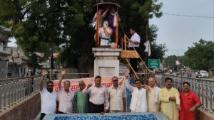 सुबह हर्रा की चुंगी स्थित अमर शहीद पं चंद्रशेखर आजाद की प्रतिमा पर माल्यार्पण कर छतरी का अनावरण किया गया।