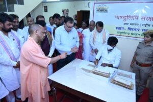 वाराणसी। शुक्रवार को सम्पूर्णानन्द संस्कृत विश्वविद्यालय, वाराणसी के परिसर में स्थित राष्ट्रीय पांडुलिपि मिशन के अंतर्गत चल दुर्लभ पांडुलिपियों के संरक्षण कार्यों के निरीक्षण एवं अवलोकन हेतु उत्तर प्रदेश के यशस्वी माननीय मुख्यमंत्री श्री योगी आदित्य नाथ का आगमन तीसरी बार हुआ।