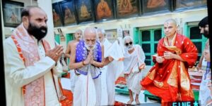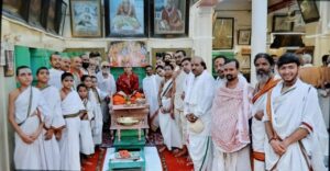 वाराणसी। रामघाट स्थित सांगवेद विद्यालय में बुधवार को गोवा के श्री गोकर्ण पर्तगाली जीवोत्तम मठ संस्थान के अधिपति पूज्यपाद 1008 विद्याधीश तीर्थ स्वामी जी महाराज का पदार्पण हुआ। विद्यालय के द्वार पर वेद मंत्रों से पूर्ण कुंभ प्रदान कर स्वामी जी का स्वागत किया गया। स्वामी जी के आसन ग्रहण के पश्चात पं गणेश्वर शास्त्री द्रविड़ जी ने काशी में स्वामी जी के चातुर्मास्य प्रसंग का वर्णन किया।