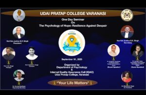 वाराणसी। उदय प्रताप महाविद्यालय, वाराणसी के राजर्षि सेमिनार हॉल में मनोविज्ञान विभाग द्वारा “विश्व आत्महत्या रोकथाम दिवस” के अवसर पर एक संगोष्ठी का सफलतापूर्वक आयोजन किया गया। कार्यक्रम का उद्देश्य आत्महत्या जैसे गंभीर सामाजिक एवं मनोवैज्ञानिक मुद्दे पर जनजागरूकता फैलाना और रोकथाम के उपायों पर चर्चा करना रहा।