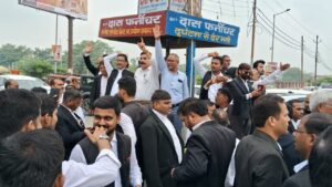 आजमगढ़।वाराणसी में अधिवक्ता और पुलिस के बीच हुई मारपीट को लेकर आजमगढ़ में सोमवार को दीवानी न्यायालय के अधिवक्ताओं ने सरकार विरोधी नारों के साथ एक परिसर से निकलकर दूसरे परिसर से होते हुए चर्च चौराहा पहुंचकर प्रदर्शन किया।