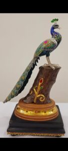 आधार भाग को उत्तम लकड़ी एवं रजत से निर्मित कर उस पर स्वर्ण की प्लेटिंग की गई है, जिससे संपूर्ण कृति और अधिक गरिमामयी प्रतीत होती है। मोर के पंखों और पुच्छ में प्रयुक्त प्राकृतिक रंग न केवल इसकी आकर्षण-छटा को जीवंत करते हैं, बल्कि इसे एक सजीव और नैसर्गिक सौंदर्य प्रदान करते हैं। यह कलाकृति न केवल शिल्पकला का अद्वितीय उदाहरण है, बल्कि भारतीय संस्कृति की रंगीन परंपरा और शाश्वत कलात्मकता का दर्पण भी है।