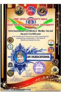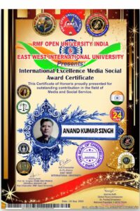 वाराणसी।मीडिया और समाजसेवा के क्षेत्र में उल्लेखनीय योगदान के लिए आनंद कुमार सिंह व डा राजेश जायसवाल को आरएमएफ ओपन यूनिवर्सिटी इंडिया एवं ईस्ट वेस्ट इंटरनेशनल यूनिवर्सिटी द्वारा संयुक्त रूप से आयोजित समारोह में “इंटरनेशनल एक्सीलेंस मीडिया सोशल अवार्ड” से सम्मानित किया गया।