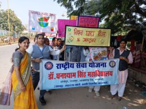 वाराणसी। डॉ. घनश्याम सिंह महाविद्यालय, सोयेपुर में गुरुवार को राष्ट्रीय सेवा योजना एवं गृह विज्ञान विभाग के संयुक्त तत्वावधान में ‘विश्व खाद्य दिवस’ के अवसर पर जन जागरूकता रैली का आयोजन किया गया। रैली का मुख्य उद्देश्य खाद्य सुरक्षा, पौष्टिक आहार के महत्व और खाद्य पदार्थों की बर्बादी रोकने के प्रति लोगों को जागरूक करना था। प्रबंधक नागेश्वर सिंह एवं प्राचार्य डॉ. आनंद सिंह ने रैली को रवाना किया। राष्ट्रीय सेवा योजना के स्वयंसेवक और गृह विज्ञान विभाग की छात्राएं नारे लिखे बैनर और पोस्टर लेकर सोयेपुर और आसपास क्षेत्र के विभिन्न मार्गों से होकर पुन: महाविद्यालय पहुंचे। छात्रों ने भोजन बचाओ, जीवन बचाओ, स्वस्थ खाओ, स्वस्थ रहो,जैसे नारे लगाकर आम जनता को जागरूक किया। राष्ट्रीय सेवा योजना इकाई एवं गृह विज्ञान विभाग की टीम ने देवा मलीन बस्ती का दौरा किया। इस दौरान, ज़रूरतमंद परिवारों के बीच खाद्य सामग्री का वितरण किया गया। वितरण के दौरान, छात्रों ने लोगों को संतुलित आहार के महत्व और स्वच्छ भोजन ग्रहण करने के तरीकों के बारे में भी जानकारी दी। इस अवसर पर राष्ट्रीय सेवा योजना कार्यक्रम अधिकारी डॉ. विपुल कुमार शुक्ला ने कहा कि विश्व खाद्य दिवस हमें खाद्य असुरक्षा और कुपोषण जैसी वैश्विक चुनौतियों के प्रति संवेदनशील बनाता है। उन्होंने छात्रों से अपील की कि वे अपने दैनिक जीवन में खाद्य पदार्थों की बर्बादी को रोकने का संकल्प लें।