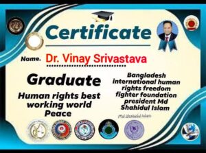 वाराणसी/नई दिल्ली।अंतरराष्ट्रीय मानवाधिकार क्षेत्र में उत्कृष्ट योगदान के लिए डॉ. विनय श्रीवास्तव को बांग्लादेश इंटरनेशनल ह्यूमन राइट्स फ्रीडम फाइटर फाउंडेशन की ओर से “ग्रेजुएट – ह्यूमन राइट्स बेस्ट वर्किंग वर्ल्ड पीस” सम्मान प्रमाण पत्र प्रदान किया गया है।