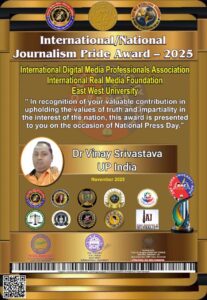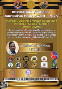 वाराणसी/लखनऊ। राष्ट्रीय प्रेस दिवस के अवसर पर अंतरराष्ट्रीय स्तर पर आयोजित विशेष समारोह में डॉ. विनय श्रीवास्तव एवं डा कैलाश सिंह विकास (उत्तर प्रदेश, भारत) को प्रतिष्ठित “International/National Journalism Pride Award – 2025” से सम्मानित किया गया। यह सम्मान International Digital Media Professionals Association, International Real Media Foundation और East West University द्वारा संयुक्त रूप से प्रदान किया गया।