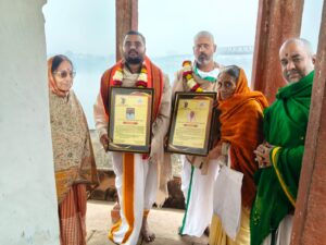 वाराणसी। रामनगर दुर्ग स्थित वेदव्यास मंदिर में गत 28 जनवरी से प्रारंभ अथर्ववेद की शौनक शाखा के संपूर्ण एकाकी कंठस्थ पारायण का कार्यक्रम सफलतापूर्वक रविवार माघ पूर्णिमा के अवसर पर संपन्न हुआ। कार्यक्रम संयोजक काशी के सुप्रसिद्ध वैदिक विद्वान वेदमूर्ति पं चंद्रशेखर घनपाठी द्राविड़ जी ने बताया कि काशीराज स्व डॉ विभूति नारायण सिंह जी द्वारा सन 2000 तक उसके उपरांत काशीराज महाराजकुमारी परिवार द्वारा विगत 70 वर्षों से अविच्छिन्न रूप से माघ मास में एकाकी कंठस्थ संपूर्ण शाखा पारायण आयोजित किया जाता रहा है ।इसी क्रम में वर्ष 2026 में अथर्ववेद की शौनक शाखा का संपूर्ण एकाकी कंठस्थ शाखा पारायण भारत के अथर्ववेद के प्रसिद्ध वैदिक विद्वान वेदमूर्ति देसिक नारायण कस्तूरे गुरु जी के शिष्य नांदेड़ महाराष्ट्र के वेदमूर्ति वेदांत विजय कुमार जोशी ने किया तथा इस पारायण के श्रोता पुणे के वेदमूर्ति श्री दुर्गादास अम्बुलगेकर गुरूजी रहे। पारायण के सफलतापूर्वक समापन पर महाराज कुमारी विष्णुप्रिया ,महाराजकुमारी कृष्णप्रिया ने विद्वान द्वय को वेद रत्नम सम्मान ,अंगवस्त्रम एवं दक्षिणा देकर सम्मानित किया।