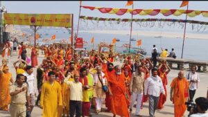 वाराणसी। अस्सी क्षेत्र स्थित श्री काशी धर्मपीठ रामेश्वर मठ से मंगलवार को श्रीमद्भागवत ज्ञानयज्ञ सप्ताह के अवसर पर भव्य कलश यात्रा निकाली गई, जो रामेश्वर मठ से प्रारंभ होकर अस्सी घाट तक पहुंची। यात्रा में सैकड़ों महिलाओं ने सिर पर कलश धारण कर भक्ति भाव से भजन-कीर्तन करते हुए भाग लिया, जिससे पूरा वातावरण भक्तिमय हो उठा।