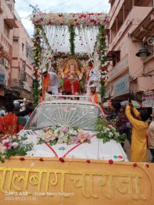 राष्ट्रपति पदक से सम्मानित दिलीप जावलकर के नेतृत्व में महाराष्ट्र के तासगांव सांगली से आये साठ सदस्यी झांसा पतक दल ने विभिन्न मुद्राओं का प्रदर्शन कर आमजन का मनमोहक लिया। शोभा यात्रा में शामिल भक्त गण प्रभुलित रहे। सभी भक्त गण सफेद वस्त्र व मराठी टोपी लगाए गणपति बप्पा मोरया के साथ चल रहे थे। लालबाग का राजा श्री गणेश जी को विभिन्न प्रकार के फूलों से सुसज्जित रथ पर विराजमान कराया था। गणपति महाराज सभी भक्त को आशीर्वाद देते रहे।