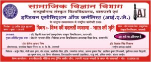 वाराणसी। सामाजिक विज्ञान विभाग, सम्पूर्णानंद संस्कृत विश्वविद्यालय वाराणसी एवं इण्डियन एसोसिएशन ऑफ जनर्लिस्ट (आईएजे) के संयुक्त तत्वावधान में *22 अप्रैल 2026, दिन बुधवार, समय 11.30 बजे स्थान योग साधना केंद्र सम्पूर्णानंद संस्कृत विश्वविद्यालय वाराणसी में राष्ट्रीय संगोष्ठी विश्व की बदलती व्यवस्था – भारत की भूमिका* विषयक संगोष्ठी का आयोजन किया गया।