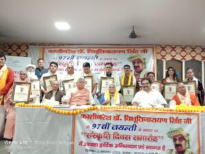 वाराणसी । काशी में शिव स्वरूप काशीराज डॉ विभूति नारायण सिंह जी की 97 वीं जयंती पर रविवार को प्रहलाद घाट स्थित बाल विश्वविद्यालय के सभागार में विश्व संस्कृत प्रतिष्ठानम के तत्वावधान मे संस्कृति दिवस समारोह का आयोजन किया गया। कार्यक्रम का शुभारंभ श्री काशी विश्वनाथ मंदिर न्यास के सदस्य के वेंकटरमण घनपाठी ने वैदिक मंगलाचरण से किया। समारोह के मुख्य अतिथि पद्मभूषण प्रोफेसर डॉ देवीप्रसाद द्विवेदी, विशिष्ट अतिथि नागरी प्रचारिणी सभा के प्रधानमंत्री डॉ व्योमेश शुक्ल, व अध्यक्षता बाल विश्वविद्यालय की निदेशिका डॉक्टर जयशीला पांडेय रहे। अतिथियों ने दीप प्रज्वलित कर व मां सरस्वती के चित्र पर माल्यार्पण कर समारोह का शुभारंभ किया।