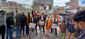 आजमगढ़।मंगलवार की रात छतवारा बाजार में भागलपुर जिले के कहलगांव से पावन धाम अयोध्या जी की सायकिल से यात्रा कर रहे अभिषेक कुमार, संदीप कुमार, गौरव कुमार, धर्मेंद्र कुमार, कन्हैया कुमार पहुंचे जहाँ बजरंगदल के कार्यकर्ता अभिषेक गुप्ता ने सभी रामभक्तों के भोजन एवं ठहरने का प्रबंध किया और सुबह में छतवारा स्थित प्राचीन हनुमान मंदिर पर पुजारी मुक्तिनाथ दास, बजरंग दल प्रांत सहसंयोजक गौरव रघुवंशी ने सभी रामभक्तों का स्वागत किया।इस अवसर पर विपिन गुप्ता, मनोहर मिश्र,भोला यादव, प्रियांशु पाठक ,अंश पाठक ,विभु सिंह समेत सभी बाजारवासी शामिल रहे।