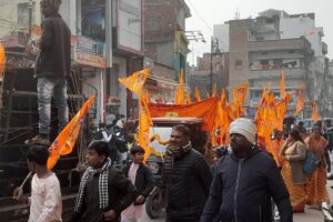 वाराणसी। श्रीराम मंदिर व प्रभु रामलला के मनोहारी विग्रह की आज उनकी जन्मभूमि अयोध्या में प्राण प्रतिष्ठा पूजन समारोह पर अर्दली बाज़ार में प्राचीन सार्वजनिक कुएं से प्रभु श्रीराम के नगर आगमन यात्रा धूमधाम से निकाली गई। यात्रा से पूर्व कुएं के पास पीपल वृक्ष व प्रभु श्रीराम को भोग अर्पित कर पूजन किया गया। उनसे आदेश लेकर यात्रा शुरु की गई। अर्दली बाजार से प्रारंभ यात्रा भोजूबीर,भुवनेश्वर नगर कालोनी,अर्दली बाजार,टकटकपुर होकर बड़े महावीरजी मंदिर पहुंच कर सम्पन्न हुई। यात्रा का संयोजन राजकुमार आहूजा और शहस्त्रांशु सिंह कर रहे थे। यात्रा में सैकड़ों की संख्या में राम भक्तजन व सरस्वती शिशु मंदिर विद्यालय के छात्र,छात्राएं और अध्यापिकाएं श्रीराम दरबार की झांकी के साथ शामिल लोग श्रीराम के जयघोष और आतिशबाजी करते चल रहे थे। यात्रा प्रारंभ में राज्यमंत्री रविंद जायसवाल भी शामिल हुए। उन्होंने श्रीराम दरबार की झांकी का पूजन कर बच्चों को मिठाई और उपहार भेंट किया। युवा ध्वज लहराकर कर नाच रहे थे। यात्रा के साथ प्रसाद वितरण भी किया गया। यात्रा का समापन महावीर मंदिर पर श्रीराम दरबार, हनुमान जी की आरती व प्रसाद वितरण से हुआ। आनंद यात्रा में राजकुमार आहूजा राजू, शहस्त्रांशु सिंह, विपुल कुमार पाठक,मनीष गुप्ता,मधुकर चित्रांश,मनोज दूबे,इंदु भूषण गुप्ता,आकाश श्रीवास्तव जुगनू,बृजेश सेठ,रामजी चौधरी,रवि श्रीवास्तव,मनीष कुमार,नवीन चौबे,कांति चौधरी,बबलू गिरी,कमल टेकचंदानी,रमेश यादव,चंदन कुमार,विपिन सिंह,गुलशन बरनवाल,संजय विश्वकर्मा,शैलेन्द्र सोनकर,दिनेश यादव पूर्व पार्षद,अमरेश सिंह,संतु बदलानी,राजू कुमार,सुमित यादव,विनोद विश्वकर्मा आदि थे।