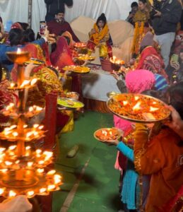 वाराणसी।आज अयोध्या में श्रीरामलला के अपने नव्य, दिव्य, भव्य मंदिर में विराजित होते ही नवापुरा (दारानगर) स्थित नवदुर्गा मनोकामना सिद्धि मंदिर जय श्रीराम, सियावर रामचंद्र की जय के गगनभेदी नारों से गूंज उठा। अपने इष्ट के स्वागत में लोग उत्साह व उमंग में भय प्रगट कृपाला दीनदयाला, राम ने लियो अवतार, अवध में धूम मची है, मेरे प्रभु राम आए हैं-दीप जलाओ, मंगल गाओ आदि राम के भजनों पर थिरक उठे। हर कोई राम की श्रद्धा व भक्ति में झूमता नज़र आया। अवसर था प्राण प्रतिष्ठा के गौरवपूर्ण अवसर पर आयोजित श्रीरामोत्सव का। इससे पूर्व प्रातः मंदिर की भव्य सजावट के साथ नवदुर्गा सहित सभी विग्रहों का फूल मालाओं से भव्य श्रृ्ंगार किया गया साथ ही सुंदर रंगोली सजाई गई।सुबह से ही ध्वनि विस्तारक यंत्र से राम भजन गुंजायमान हो रहा था। श्रीराम ज्योति प्रज्ज्वलित कर श्रीराम की दीपमालिका सजाई गई। तदोपरान्त श्री रामलला के स्वरुप को सिंघासन पर विराजमान कराया गया। रंगबिरंगी साड़ी में सजी महिलाओं ने अपनी सुसज्जित आरती की थाली से श्रीरामलला के सजीव झांकी की सामूहिक आरती उतारी। साथ ही नवदुर्गा की आरती की गई।