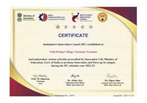 वाराणसी। शिक्षा मंत्रालय भारत सरकार द्वारा यूपी कॉलेज के इंस्टीट्यूशंस इनोवेशन सेल (आईआईसी) को सत्र 2022-23 में कैंपस में विभिन्न गतिविधियों को आयोजित करने के लिए स्टार रेटिंग सर्टिफिकेट प्रदान किया गया है। प्राचार्य प्रो धर्मेन्द्र कुमार सिंह ने प्रशन्नता व्यक्त करते हुए यूपी कॉलेज के इंस्टीट्यूशंस इनोवेशन सेल की पूरी टीम को बधाई दी है।