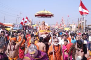 इसी क्रम में भगवान् शंकर स्वरुप परामाराध्य परमधर्माधीश उत्तराम्नाय ज्योतिष्पीठाधीश्वर जगद्गुरुशंकराचार्य स्वामिश्री: अविमुक्तेश्वरानंद: सरस्वती ‘1008’ जी महाराज् अपने भक्तों और अनुयायियों के साथ त्रिवेणी संगम स्नान को पहुंचे। प्रातः 9 बजे महाराज जी का दिव्य-भव्य जुलूस साधु संतों,मंडलेश्वरों, महामंडलेश्वरों,भक्तों और अनुयायियों के साथ शंकराचार्य शिविर से संगम स्नान के लिए रवाना हुआ।