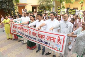 वाराणसी।आगामी पर्व 2024 लोकसभा चुनाव को देखते हुए 1 जून वाराणसी में होने वाले लोकसभा चुनाव के मद्देनजर मछोदरी स्थित श्री स्वामी नारायण मंदिर के मंहत संत श्री स्वामी प्रेम स्वरूप दास जी के आवाहन पर सामाजिक संस्था सुबह- ए-बनारस क्लब के बैनर तले मैदागिन स्थित श्री हरिश्चंद्र बालिका इंटर मीडिएट कॉलेज के परिसर में अपना पहला वोट डालने का बेताबी से इंतजार कर रहे छात्राओं को निर्भीकता से अपना पहला मत डालने के लिए प्रेरित करने हेतु एक जन जागरुकता अभियान चलाया गया।